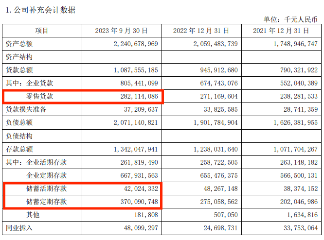截至2023年三季度末,南京银行零售客户AUM(管理金融资产规模)实现较快增长,达到7205.24亿元,较年初增长995.77亿元,增幅16.04%。个人存款余额4121.15亿元,较年初增长887.89亿元,增幅27.46%,在各项存款中占比30.71%;较年初上升4.59个百分点。