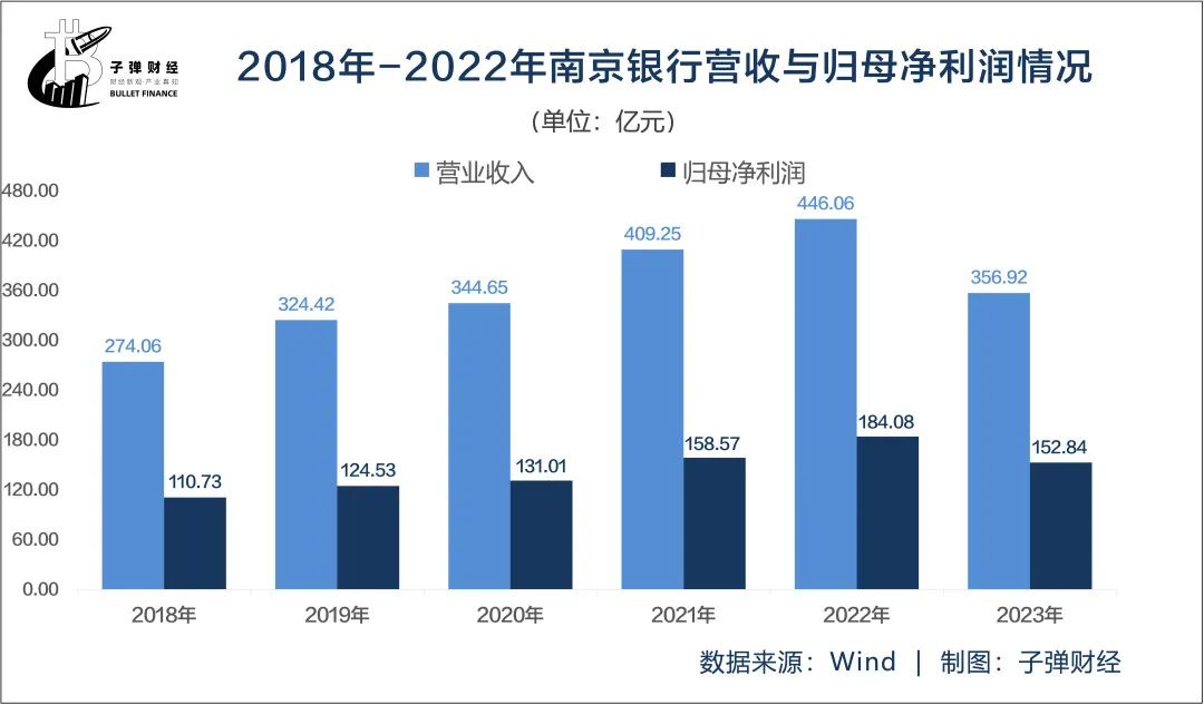 「界面新闻·子弹财经」翻看其近五年经营业绩发现,2018年至2022年,南京银行营业收入分别为274.05亿元、324.42亿元、344.65亿元、409.25亿元和446.06亿元,同比增长10.33%、18.38%、6.24%、18.74%和9%。