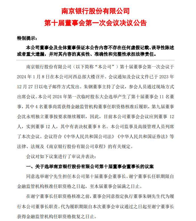 2024年1月8日,南京银行第十届董事会第一次会议,在该行河西总部大楼召开。该行2024年第一次临时股东大会选举产生了第十届董事会11名董事,其中4名董事尚需获得金融监管机构董事任职资格核准后履职,第九届董事会沈永明独立董事按要求继续履职。