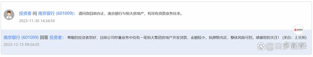 而对于投资者询问的南京银行与恒大集团贷款业务往来问题,南京银行则向外界抛出了一颗“定心丸”,称该行存量业务中仅有一笔恒大集团房地产开发贷款,金额较小,抵押物充足,整体风险可控。