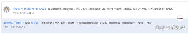近期,针对南京银行牵头三胞集团债委会一事,有投资者提问称“如今三胞集团债务未能化解,南京银行的这部分贷款,在财务上是否计提了坏账准备”。对此,该行回复称其按照稳健审慎原则,已足额计提减值准备。