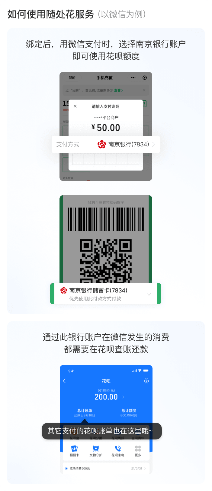 5 月 12 日消息,近日有网友发现,花呗联合南京银行上线了“随处花”服务:在花呗里开通一张南京银行花呗额度专属银行卡后,再将该卡绑定微信、抖音、京东等支付平台,使用该张银行卡即为使用花呗额度进行消费。