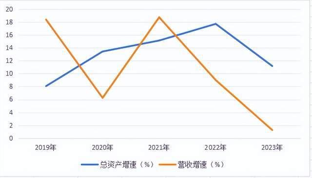 从2019年到2023年,近5年时间,南京银行的总资产在2020年至2023年,增速保持着两位数的增长,而营收增速从2019年的18.38%降到了1.24%,资产规模的增长对营收的拉动作用越来越小。