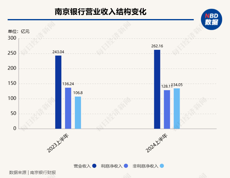 从营收的构成来看,非息净收入高增是推动营收增长的主要动力。上半年,南京银行实现非利息净收入134.05亿元,同比增长25.51%,在营业收入中占比达51.13%,同比上升7.19个百分点。其中,投资收益和公允价值变动的净收益合计超100亿元,同比增长了23.52%,金融市场板块延续稳中向上的经营态势。