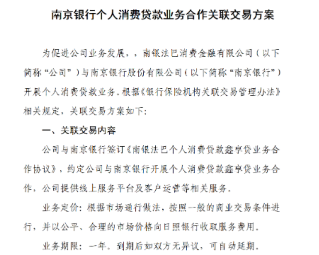 根据关联交易方案,南银法巴与南京银行签订《南银法巴个人消费贷款鑫享贷业务合作协议》,约定公司与南京银行开展个人消费贷款鑫享贷业务合作,公司提供线上服务平台及客户运营等相关服务。