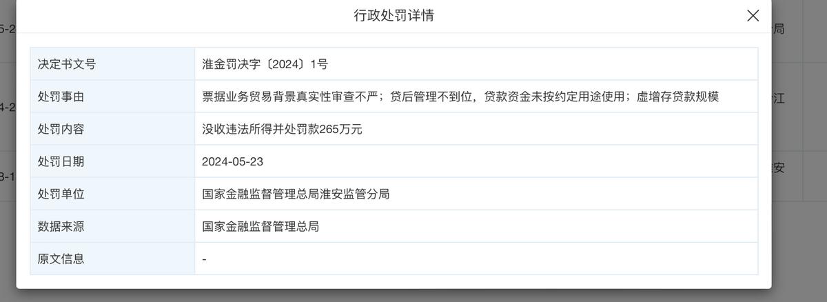 24年5月南京银行股份有限公司淮安分行因贷后管理不到位等违规行为被罚265万。