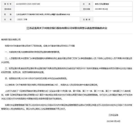 上述行为违反了《证券投资基金托管业务管理办法》(证监会令第172号)第八条、第十四条、第二十一条、第二十六条、第三十一条和第三十八条的规定。依据《证券投资基金托管业务管理办法》第四十条的规定,江苏证监局决定对南京银行采取出具警示函的行政监督管理措施。南京银行应对上述问题进行整改,并于收到决定之日起30天内向江苏证监局提交书面整改报告,江苏证监局将视情况进行检查验收。