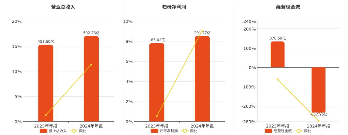 公司营业总收入为502.73亿元,较去年同报告期营业总收入增加51.14亿元,实现5年连续上涨,同比较去年同期上涨11.32%。归母净利润为201.77亿元,较去年同报告期归母净利润增加16.75亿元,实现5年连续上涨,同比较去年同期上涨9.05%。经营活动现金净流入为-657.95亿元。