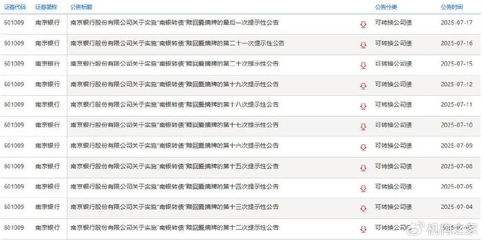 昨日晚间,南京银行股份有限公司(以下简称“南京银行”,600926.SH)发布消息,即实施“南银转债”赎回暨摘牌前的最后一次(第二十二次)提示性公告。