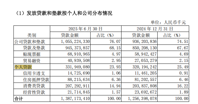 而同期,宁波银行的个人贷款收入不仅由2024年的152.75亿元,下降至今年上半年的140.43亿元;贷款余额也由上年末的5577.35亿元,降至5353.1亿元。