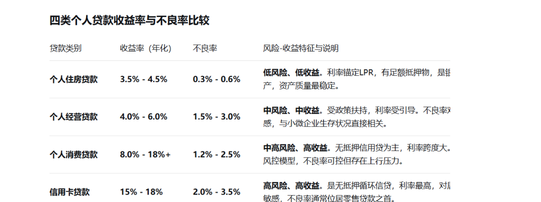 DS基于2023年年报、2024年半年报以及行业公开报告(如中国人民银行、国家金融监督管理总局发布的数据)中的典型值进行整理,旨在展示这四类贷款在年化收益率和不良率上的显著差异及其排序。