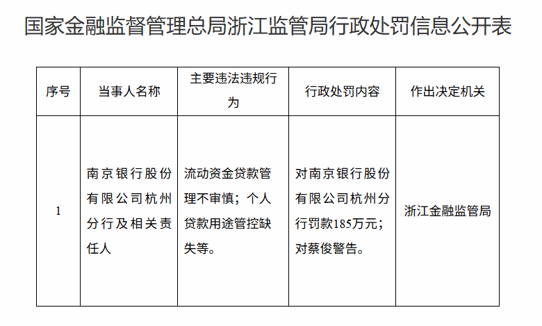 3月19日,浙江金融监管局披露的行政处罚信息显示,南京银行股份有限公司杭州分行因流动资金贷款管理不审慎、个人贷款用途管控缺失等违法违规行为,被罚185万元,相关责任人蔡俊受到警告。