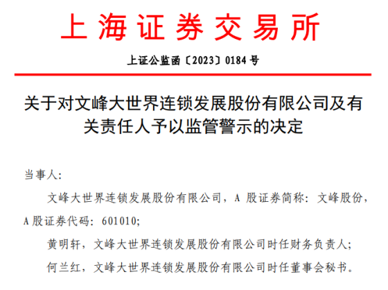因此,根据《股票上市规则》第13.2.2条和《上海证券交易所纪律处分和监管措施实施办法》等有关规定,上交所文峰股份及黄明轩、何兰红予以监管警示。