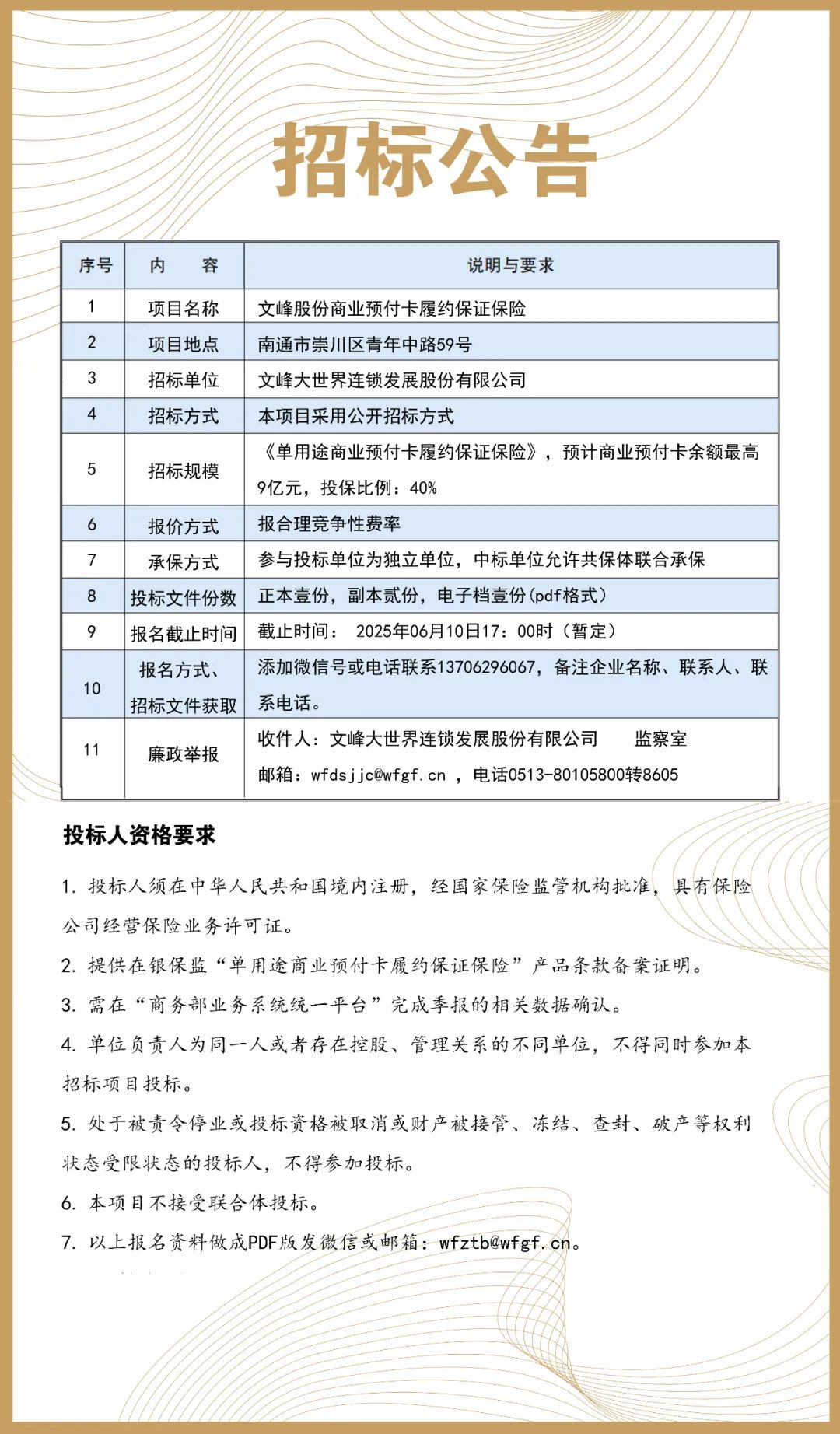文峰股份商业预付卡履约保证保险招标公告