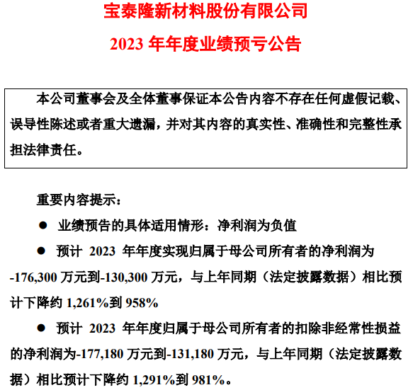 1月12日晚,宝泰隆发布2023年业绩预亏公告显示,预计2023年年度实现归母净利润为-13.03亿至-17.63亿元,与上一年同期相比预计下降约958%—1261%,预计2023年扣非净利润为-13.12亿至-17.72亿元,与上年同期相比预计下降约981%—1291%。