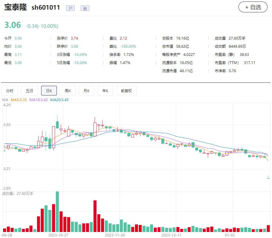 公司2023年年度大额预亏的公告发出后,1月15日开盘,宝泰隆股价直接一字跌停。截至1月15日收盘,公司股价3.06元/股,总市值58.62亿元。