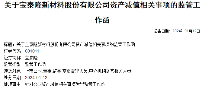 同一天,上交所向公司火速下发两份监管工作函。针对业绩预告相关事项发出的监管工作函涉及的对象为上市公司宝泰隆、中介机构及其相关人员,针对资产减值相关事项发出的监管工作函涉及的对象为上市公司宝泰隆、董事、监事、高级管理人员、中介机构及其相关人员。