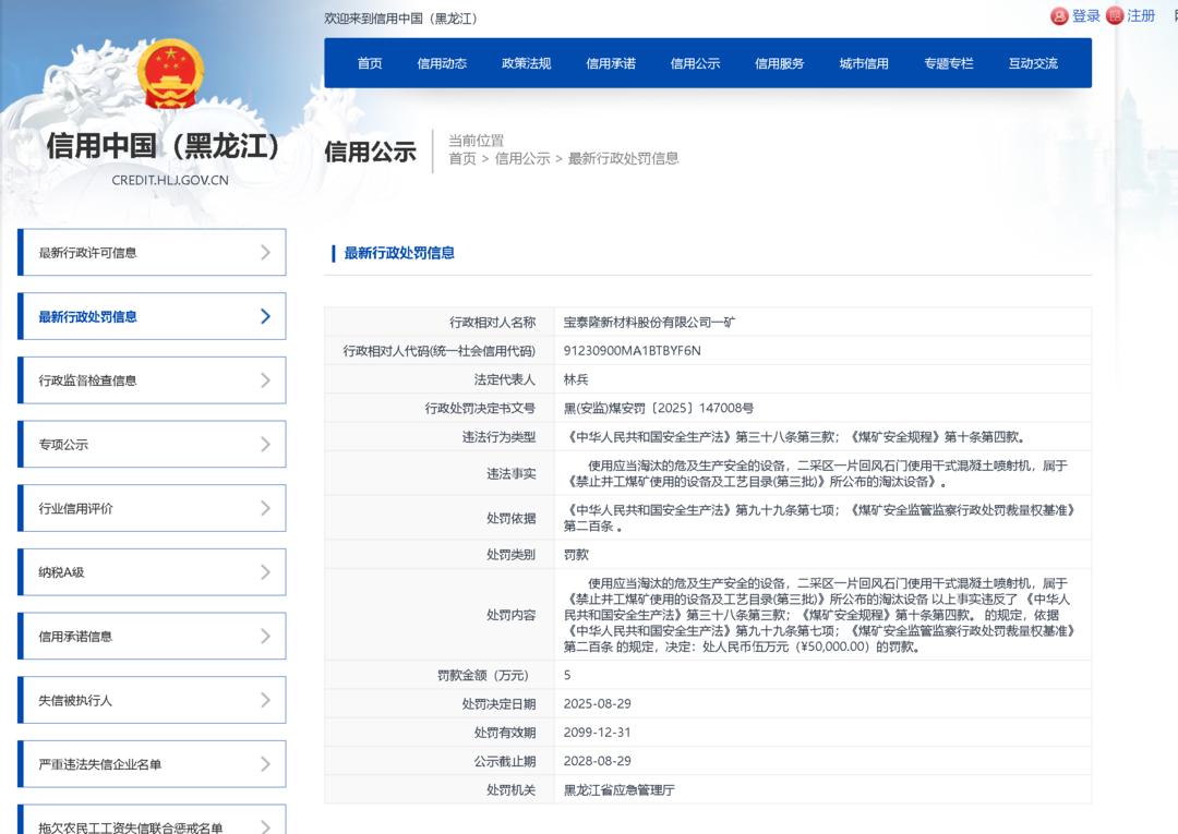 近日,记者从信用中国(黑龙江)获悉,宝泰隆新材料股份有限公司一矿因使用应当淘汰的危及生产安全的设备,二采区一片回风石门使用干式混凝土喷射机,属于《禁止井工煤矿使用的设备及工艺目录(第三批)》所公布的淘汰设备》。被黑龙江省应急管理厅罚款5万元。