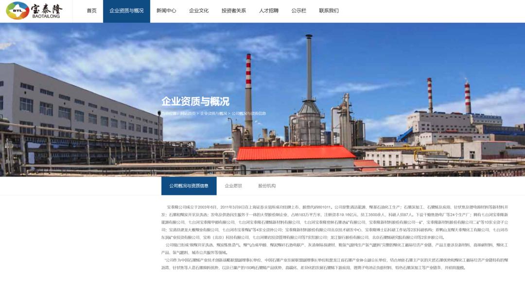 宝泰隆公司成立于2003年6月,2011年3月9日在上海证券交易所成功挂牌上市,股票代码601011。公司是集清洁能源、煤基石油化工生产;石墨深加工、石墨烯及应用、针状焦及锂电原材料等新材料开发;石墨和煤炭开采及洗选;发电及供热民生服务于一体的大型股份制企业,占地183万平方米,注册资本19.16亿元,员工3500余人,科研人员87人。下设干熄焦热电厂等24个生产厂;拥有七台河宝泰隆新能源有限公司、七台河宝泰隆甲醇有限公司、七台河宝泰隆石墨烯新材料有限公司、七台河宝泰隆密林石墨选矿有限公司、宝泰隆新材料股份有限公司一矿、宝泰隆新材料股份有限公司二矿等10家全资子公司;宝清县建龙大雁煤业有限公司、七台河市宝泰煤矿等4家全资孙公司;宝泰隆新材料股份有限公司北京技术研发中心、宝泰隆博士后科研工作站等2家科研机构;双鸭山龙煤天泰煤化工有限公司、七台河市东润矿业投资有限公司、宝希(北京)科技有限公司、七台河墨岩投资管理有限公司等7家控股公司;龙江银行股份有限公司、北京石墨烯研究院有限公司等2家参股公司。