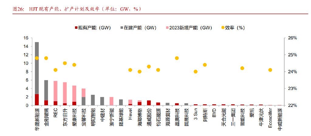 多家厂商布局 HJT 电池,规划产能高速增长。HJT 的短期成本劣势主要集中于成本过高。1)银耗:通过多主栅技术、银包铜技术可使 HJT 的银耗大幅下将,2022 年异质结电池双面低温银浆消耗量约 19.5-25mg/W,如果未来叠加 0BB 技术,单位银耗有望降低至 12- 14mg/W;2)设备投资:未来随着设备生产能力的提高及技术进步,单位产能设备投资额有望进一步下降。因此,国内企业积极布局 HJT,根据 PVInfoLink 统计数据,2022-2023 年 HJT 产能有望达到 13GW、48GW。