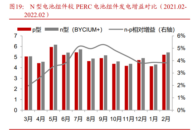 发电增益明显+BOS 成本下降,新型电池组件实证优势显著。当前节点新型电池技术渗透率提升,以 N 型 TOPCon 电池为例,TOPCon 电池组件具备低衰减、高双面率、低温度系数等优势使得组件拥有更好的发电增益,在相同光照条件下具备更高的发电效率同时电池的高转换效率能有效摊薄组件 BOS 成本。以 TüV 北德银川实证电站为例(182 尺寸, TOPCon 钝化接触电池技术):1)发电效率:2021 年 2 月到 2022 年 2 月数据显示,电池组件单瓦发电量比 P 型组件高 3.9%左右;2)BOS 成本:N 型组件的 BOS 成本下降在 1%~3.5%之间。度电成本显著下降,TOPCon 较 PERC 组件 LCOE 成本降幅 3%~7%。根据 TüV 北德银川电站数据,位于菲律宾、卡塔尔、西班牙、智利的 N 型电池组件项目分别较 P 型电池组件有 2.91%~5.45%、4.00%~6.17%、3.59%~6.93%、3.23%~5.46%LCOE 成本下降。
