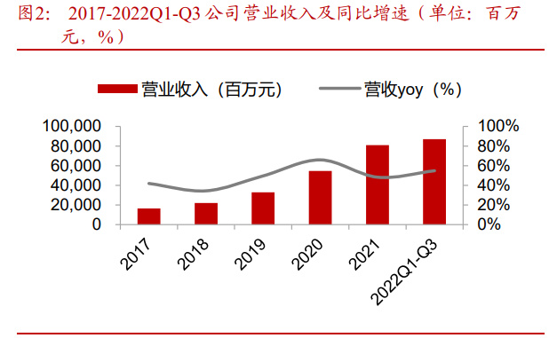 受益于光伏行业持续景气,公司业绩保持高速增长。2019-2021年,公司营业收入分别为 328.97 亿元、545.83 亿元和 809.32 亿元,同比增速分别为 49.62%、65.92%和 48.27%;归母净利润分别为 52.80 亿元、85.52 亿元和 90.86 亿元,同比增速分别为 106.40%、61.99%和 6.24%。2022 年前三季度,公司实现营业收入 870.35 亿元,同比增长 54.85%;实现归母净利润 109.76 亿元,同比增长 45.26%,根据 2022 年业绩预增公告,公司预计 2022 年归母净利润为 145-155 亿元,同比增长 60%-71%。受益于下游光伏装机需求的高景气拉动,公司单晶硅片和组件出货量实现高速增长,营业收入和归母净利润规模。