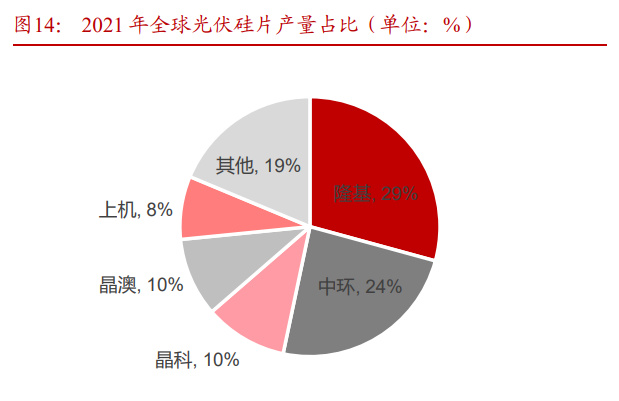 硅片双寡头格局清晰,隆基绿能和 tcl 中环硅片 CR2 产量占比超 40%。2021-2022 年,隆基绿能、TCL 中环在硅片环节双寡头格局稳定,产量 CR2 占比分别为 53%、48%。分别占据全球硅片产出的 20-30%份额,较其他二线生产企业有显著的规模优势,其余一体化公司或者硅片生产企业产量占比约为 5-10%。