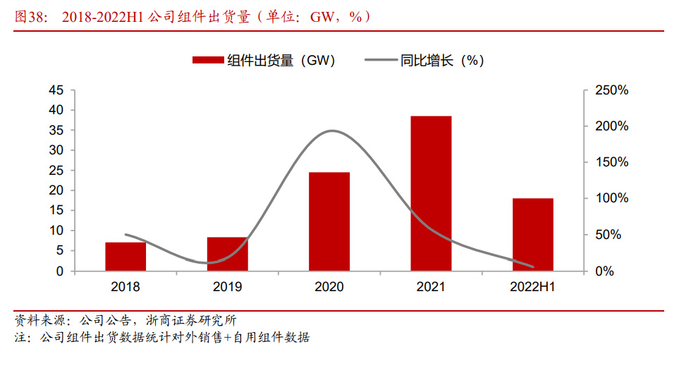 一体化龙头竞争优势突出,组件出货高速增长。2019-2021年,公司组件出货量(外销+自用)分别为 8.37GW、24.53GW、38.52GW,分别同比增长 28.28%、193.25%、57.03%,光伏装机需求维持较高景气度,公司积极扩建产能把握景气窗口期,组件出货量规模实现高速增长,2022 年 H1,公司组件出货量为 18.02GW,同比增长 5.94%。