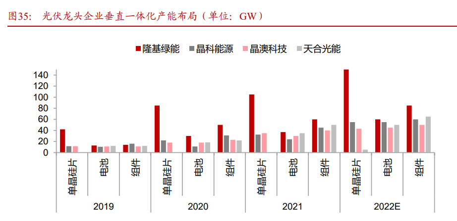 龙头垂直一体化布局,相比专业化企业成本控制能力更强。近年来,隆基、天合、晶科、晶澳等行业龙头纷纷进行垂直一体化布局。提高上下游一体化程度,一是可以提升自供保障,同时实现一体化降本;二是有利于企业在技术迭代过程中各环节之间能有更好的配合,使得技术革新可快速嵌入,取得市场先发优势;三是可以有效平抑产业链价格波动对公司盈利的影响,增强抗风险能力。以 2021 年为例,在多晶硅价格持续上涨的背景下,一体化企业组件业务仍保持 12%以上的毛利率,而专业化企业协鑫集成和亿晶光电组件毛利率分别为 5.37%和-2.43%。