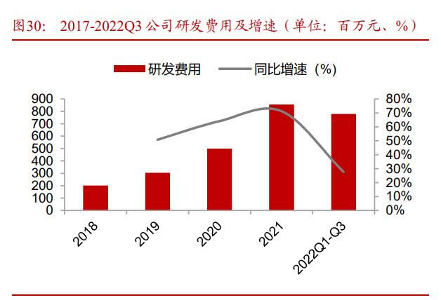 技术实力引领同业,研发费用逐年增加。2019-2021年公司研发费用分别为3.04亿元、 4.99 亿元、8.54 亿元,分别同比增长 64%、71%、28%,研发费用维持高增速。2022Q1-Q3 公司研发费用为 7.78 亿元,同比增长 28%。公司持续加大研发投入,目前已经研发和储备了多种新型电池技术,转换效率行业领先: 1)N-TOPCon:2023 年 3 月公司公告鄂尔多斯电池项目采用 N-TOPCon 电池路线,预计量产电池转换效率将达 25%以上; 2)HPBC:2022 年 11 月公司发布会表示 HPBC电池量产技术突破 25.3%,叠加氢钝化技术的 PRO 版效率可以超过 25.3%; 3)HJT:2021 年至今,分别以 26.74%、26.78%、26.81%的效率持续突破晶硅转化效率极限,不断刷新晶硅电池转化效率世界纪录。