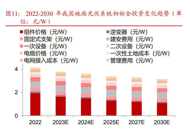光伏、储能系统成本逐年下降,光储平价有望进一步催化终端装机需求。2022 年我国地面光伏系统的初始投资成本为 4.13 元/W 左右,预计 2023 年随着产业链各环节新建产能逐步释放,组件效率稳步提升,光伏系统初始全投资成本预计可以降低至 3.79 元/W。其中部分保障性并网项目要求配置电化学储能,如果按照装机容量 15%,配储 2 小时计算,初始投资成本增加 0.5 元/W。2022 年我国锂电储能系统约为 1.66 元/Wh(0.5C 系统),中长期而言,随着规模化生产和上游电池级碳酸锂价格下降,锂电储能系统成本有望进一步下降。光伏系统和储能系统的成本下降有望进一步催化光伏装机需求。