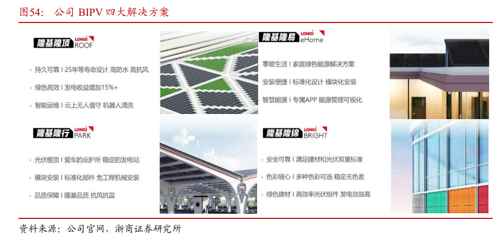 公司收购森特股份,前瞻布局 BIPV 业务。2021 年 3 月 5 日,公司公告拟协议转让现金收购森特股份 27.25%的股权,交易完成后公司成为森特股份第二大股东。2022 年 3 月,公司全资子公司隆基绿建与森特股份签订股权转让协议,公司将下属子公司隆基工程 100%股权出售给森特股份。2022 年 4 月 1 日晚间,森特股份发布公告,拟以现金人民币 6849 万元收购西安隆基绿能建筑科技有限公司持有的隆基绿能光伏工程有限公司 100%股权。至此,双方成为合作伙伴,促进业务融合,充分发挥森特股份在建筑屋顶设计、维护上的优势,同时结合隆基绿能在 BIPV 产品制造上的优势,共同开拓大型公共建筑 BIPV 市场。进军建筑光伏一体化市场,布局 BIPV 是公司实现产业延伸和产业升级的战略举措。 2018 年隆基开始布局 BIPV 领域,经过三年的研发,2020 年正式发布“隆顶 BIPV”,将光伏组件置于压型钢板之上,通过可滑移支座连接,实现屋顶与光伏组件的结合。除了“隆顶”系列,公司将针对特定应用场景布局BIPV业务,包括“隆行系列”光储充一体绿电车位,“隆锦系列”美学光电幕墙,“隆易系列”家庭光储智慧能源。并且,公司有望在四五年内将 BIPV业务打造成一个每年营收超百亿的业务板块,将成为公司持续增长的新发力点。