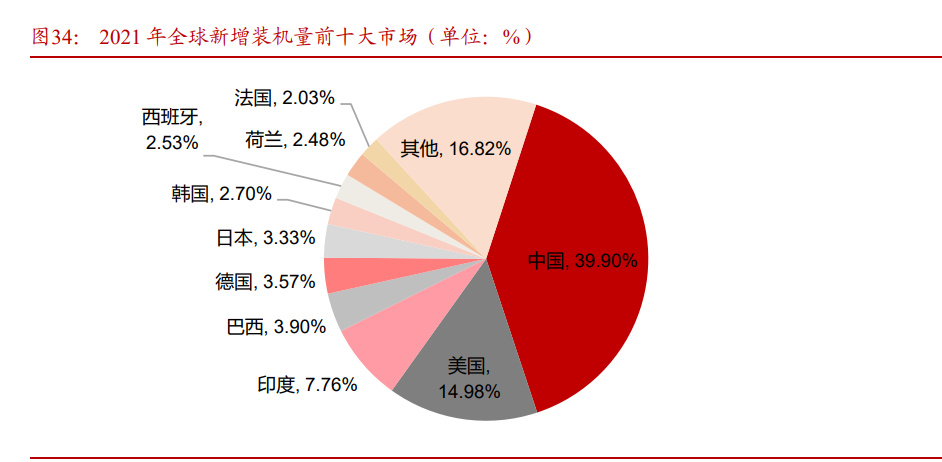光伏市场全球化,政策和经济性驱动全球市场爆发。在政策和经济性驱动下,全球光伏装机市场呈现多点开花局面,根据 IRENA数据,2021年全球光伏新增装机市场中亚洲、欧洲、美洲市场均有大规模光伏需求,其中中国、美国、印度分别新增装机 52.99GW、 19.90GW、10.30GW,占比 39.90%、14.98%、7.76%。