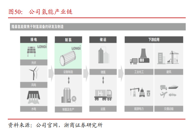 氢能战略布局起步,预计 2025 年氢能业务产能拓展至 5-10GW。公司自 2018 年起,对氢能产业链进行战略研究,与国内外科研机构合作研发电解水制氢装备技术。2021 年,公司成立了西安隆基氢能科技有限公司,致力于成为全球领先的大型绿氢装备与方案提供商,为全球绿色低碳转型提供绿氢解决方案。氢能业务团队完成搭建,业务规划定位基本清晰,实现首台 1000Nm3/h 碱性水电解槽成功下线,截至 2021 年末,公司已初步具备了订单获取能力和500MW生产交付能力。公司现拥有无锡制氢设备工厂与多个氢能生产基地,全球首台套 4000Nm3/h 制氢系统已于 2022 年 3 月完成实证测试,2022 年规划产能达到 1.5GW,2025 年预计规划产能达到 5-10GW,公司氢能业务拓展迅速。