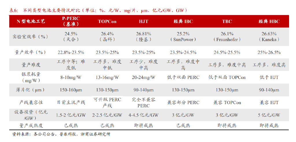 新型电池技术主要包括 TOPCon、HJT、IBC 等。TOPCon 和 HJT 电池实现效率提升的方式都是通过钝化降低少子表面复合速率。但 TOPCon 电池通过隧穿氧化层,HJT 电池通过沉积非晶硅薄膜,方式差异导致各自工艺差别,从而导致两者商业化成本的差值。 IBC 电池则是一种将 p+掺杂区域和 n+掺杂区域均放置在电池背面(非受光面)的电池技术,其发射极、表面场和金属电极都做在电池背面。(1)TOPCon 电池工艺设备产线兼容性好,可基于现有 PERC 产线升级改造,只需增加硼扩散和薄膜沉积设备,PERC 产线升级改造成本仅约 0.5-0.7 亿元/GW。(2)HJT 电池具有工艺流程简单(主要环节仅 4 步)、双面率高、低光衰、薄片化等优点,但同时面临设备投资额较大,银浆、靶材等材料成本过高的挑战。(3)IBC 电池正表面无任何栅线遮挡,吸光面积最大,转换效率最高,且可与 TOPCon/HJT 等其他晶硅技术叠加,但量产难度较大,设备投资额较高。