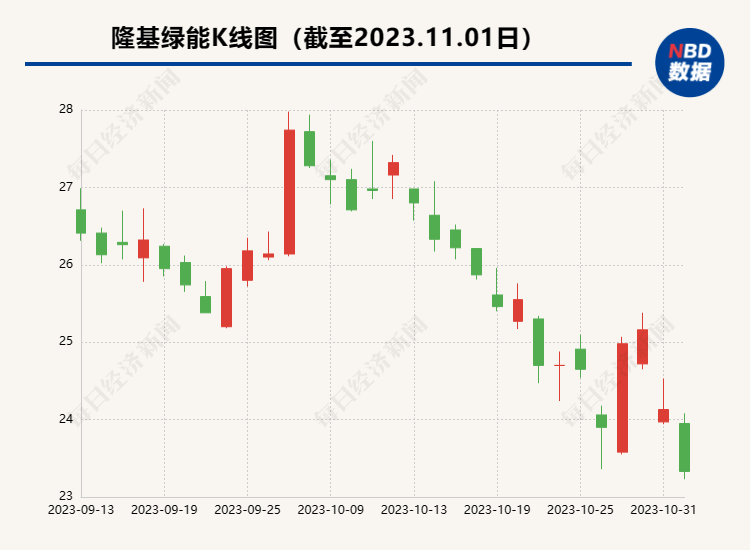 11月1日,隆基绿能股价开盘后持续走低,截至今日收盘,报23.33元/股,跌幅达3.32%。