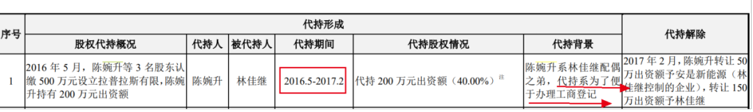 其中,陈婉升是林佳继配偶的弟弟,代林佳继持股,代持时间从2016年5月持续到2017年2月。对此,招股书解释,代持是为了便于办理工商登记。