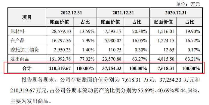招股书显示,2020年-2022年,公司存货账面价值分别为7618.31万元、3.73亿元、21.03亿元,占公司各期末流动资产的比例分别为55.69%、40.69%、44.54%。