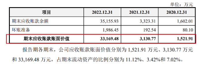同期,公司应收账款账面价值分别为1521.91万元、3130.77万元、3.32亿元,占期末流动资产的比例分别为11.12%、3.42%和7.02%。