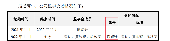 虽然代姐夫持股,但陈婉升在拉普拉斯的存在感并不算高。招股书显示,2021年1月-2022年11月,陈婉升是监事会成员,但于2022年11月离任。