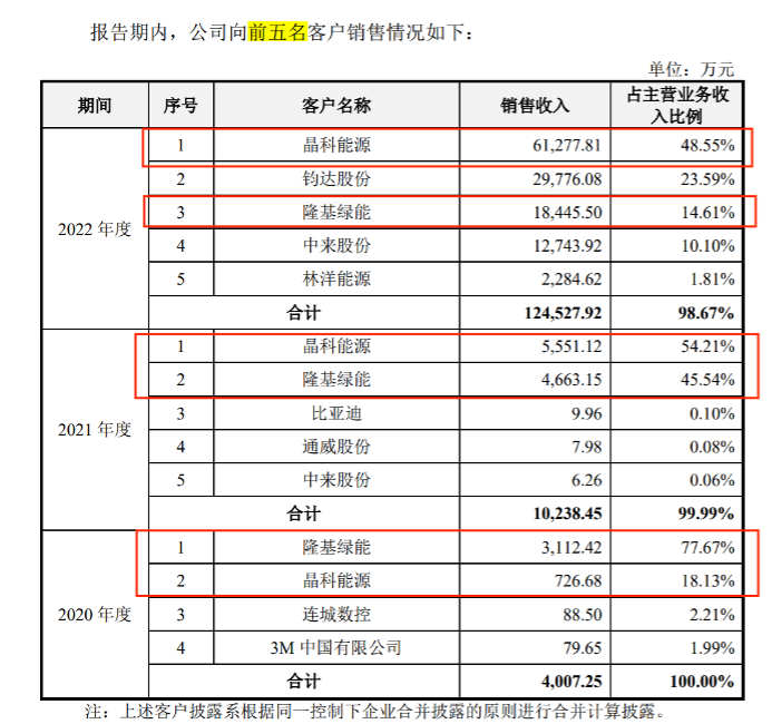 其中,隆基绿能、晶科能源于报告期内一直是拉普拉斯的前三大客户,而这两家鼎力支持的客户均与拉普拉斯关系匪浅。