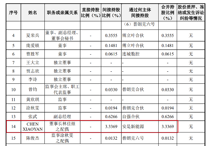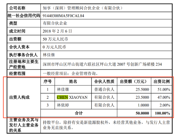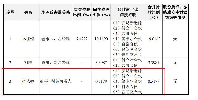 我们注意到,林佳继格外关照这个表妹。在林佳继实际控制的安是新能源,林依婷担任监事。而安是新能源的大股东知享合伙股东则是林佳继夫妻以及林依婷。