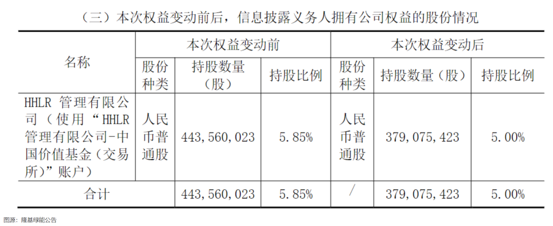 早在今年3月21日,隆基绿能曾发布公告称,HHLR公司将其持有的6448.46万股隆基绿能股份参与转融通证券出借业务,出借股份占隆基绿能总股本的0.85%,出借期限为182天。该部分股份出借期间不登记在HHLR公司名下,导致其持股比例由5.85%减少至5.00%。
