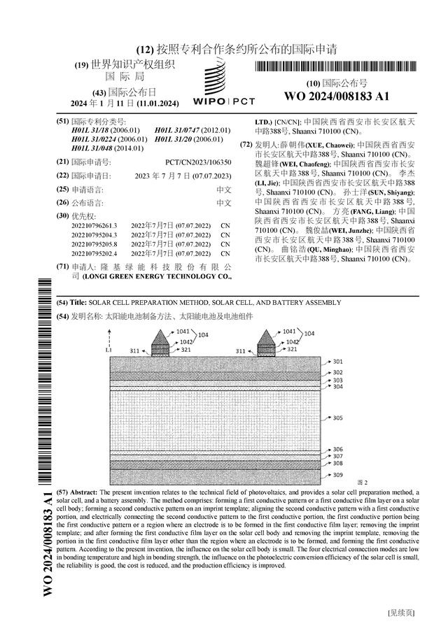 数据显示隆基绿能(601012)公布了一项国际专利申请,专利名为“太阳能电池制备方法、太阳能电池及电池组件”,专利申请号为PCT/CN2023/106350,国际公布日为2024年1月11日。