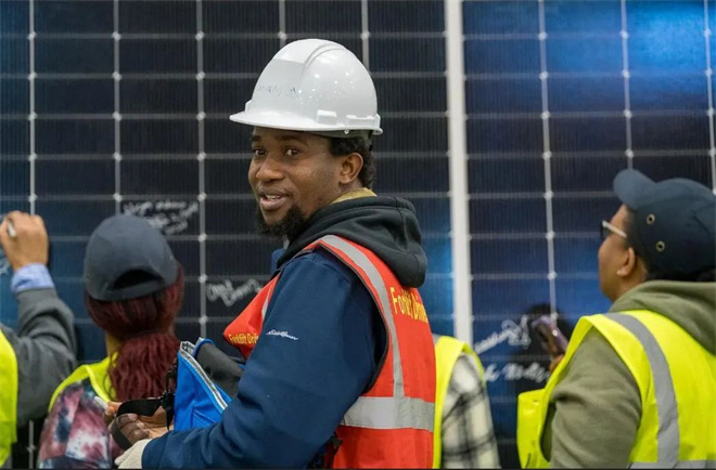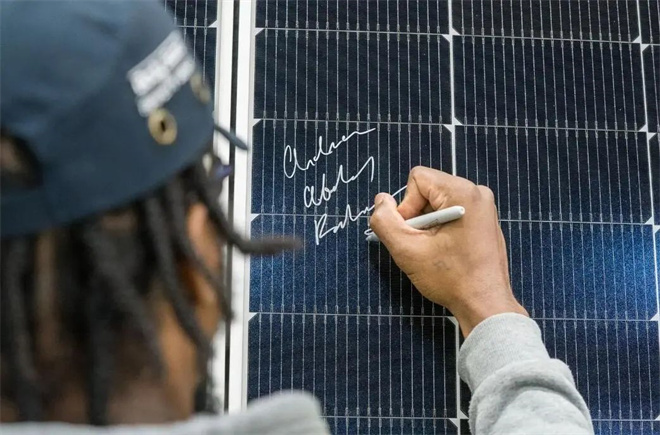 在lluminate USA下线的首批组件产品上,一位员工签名留念