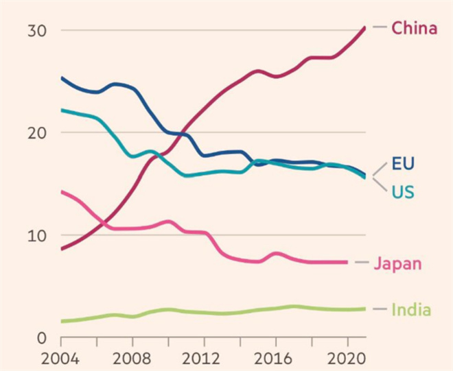 中国在全球制造业增加值中的占比;来源:世界银行、FT