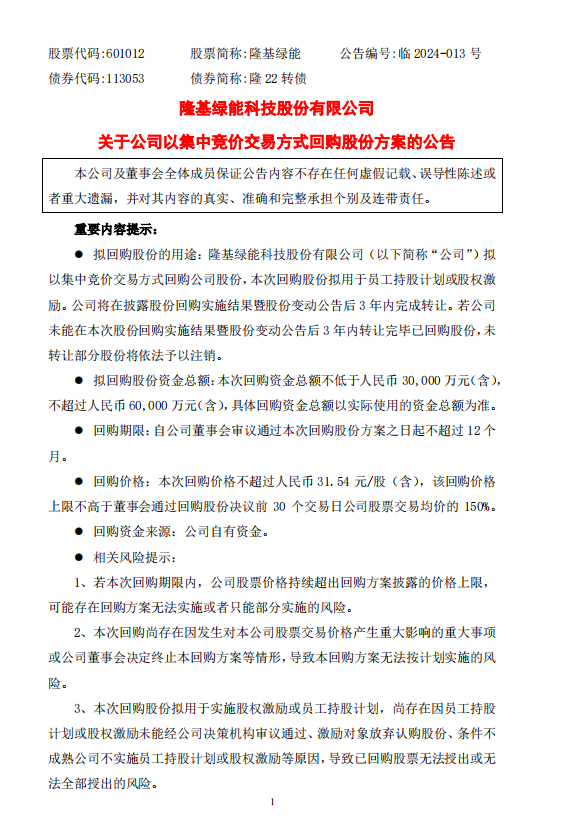 【信披日报】隆基绿能科技股份有限公司关于公司以集中竞价交易方式回购股份方案的公告
