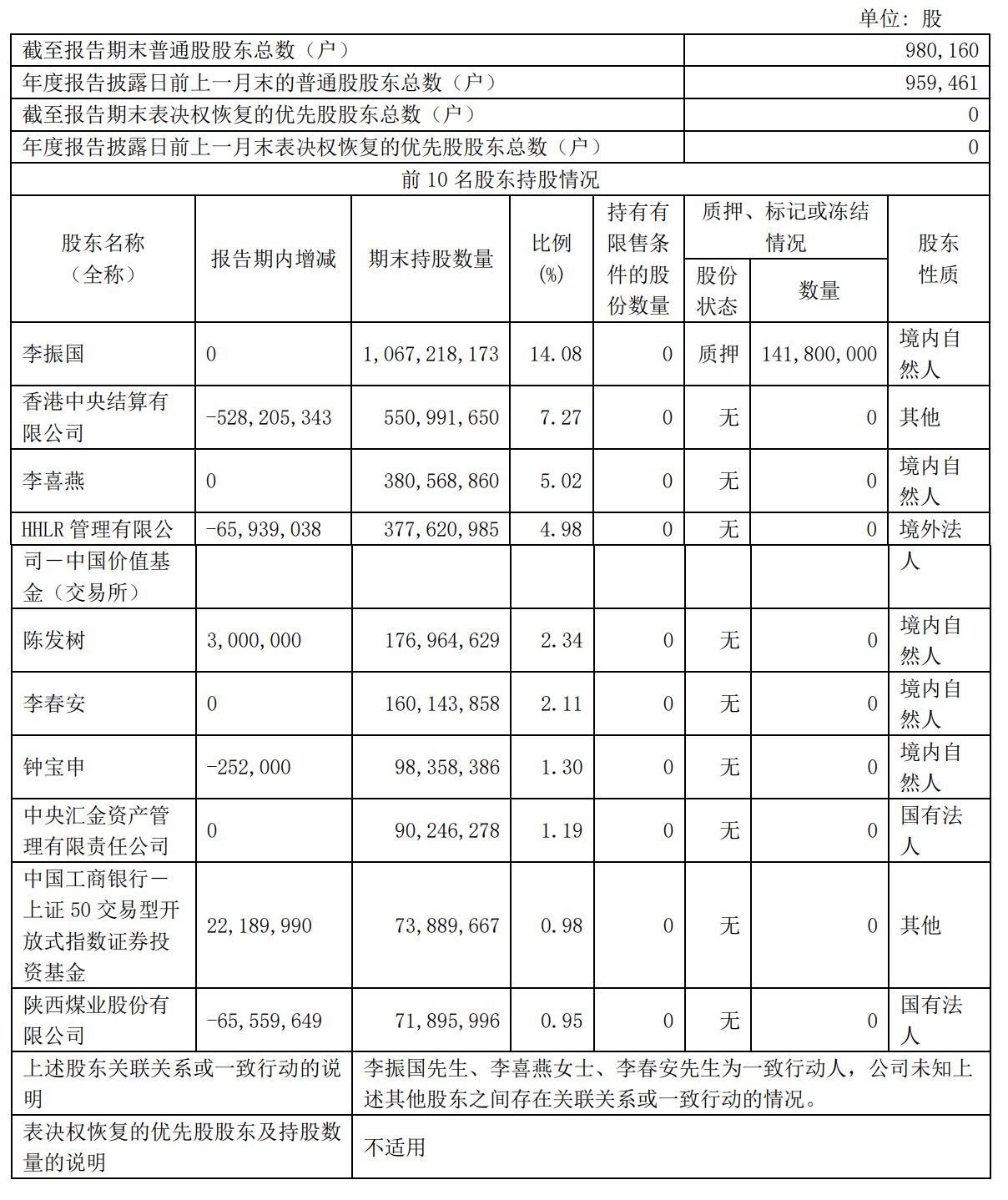 截至2024年3月31日,李振国持股14.08%,香港中央结算有限公司持股5.77%,李喜燕持股为5.02%,高瓴旗下HHLR 管理有限公司-中国价值基金(交易所)持股为4.98%,陈发树持股2.34%,李春安持股为2.11%;