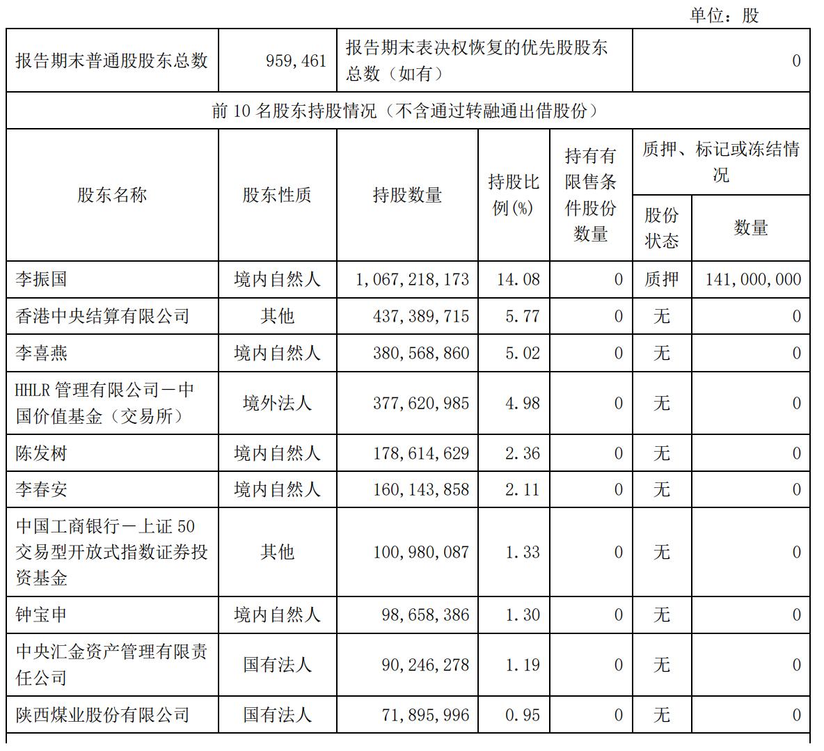 钟宝申持股为1.3%,中央汇金资产管理有限责任公司持股为1.19%,中国工商银行-上证 50 交易型开放式指数证券投资基金持股为0.98%,陕西煤业股份有限公司持股为0.95%。