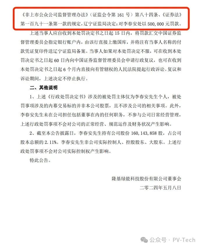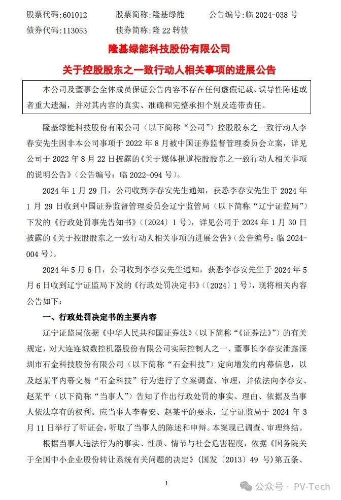 5月7日晚,隆基绿能公告,2024年5月6日,公司收到李春安通知,获悉李春安于当日收到辽宁证监局下发的《行政处罚决定书》(〔2024〕1号)。